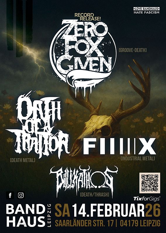 [Sa, 14.02.2026] - Bandhaus Leipzig - 15€  + Zero Fox Given (Melodic Death Metal) + Oath Of A Traitor (Symphonic Metal) + FIIIIIX (Industrial Metal) + Bullkathos (Groove Metal)